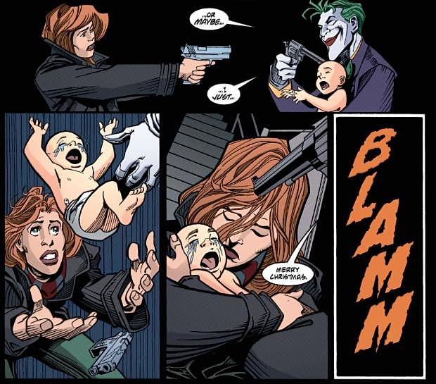 estava concentrada em pegar a criança, o Coringa atirou em sua cabeça.